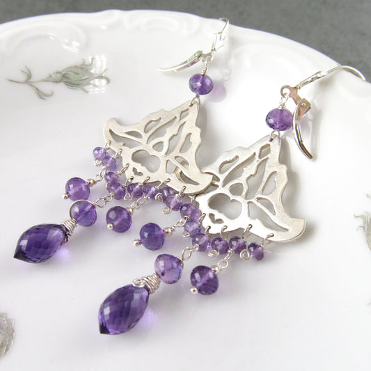 Amethyst chandelier earrings, handmade recycled sterling silver earrings-OOAK February birthstone jewelry