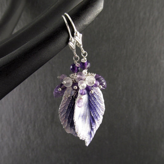 Purple enamel leaf earrings in fine silver with amethyst, moonstone and lavender sapphire