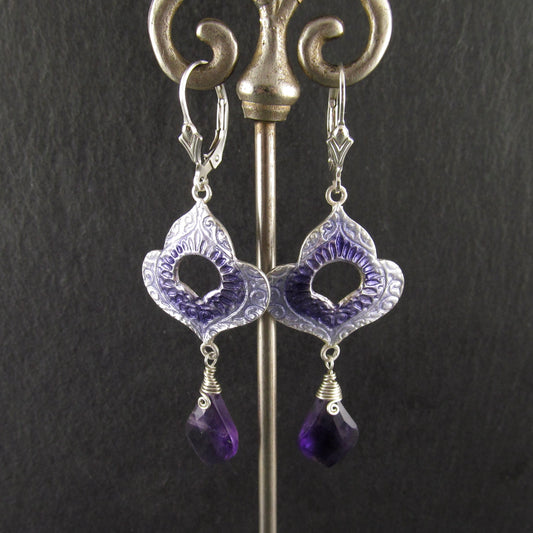 Amethyst and purple enamel earrings, recycled fine silver earrings