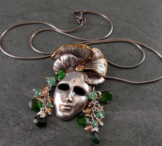 Green goddess mask, handmade recycled fine silver face mask pendant featuring a gingko leaf headdress edged with 22k gold, sapphires-OOAK
