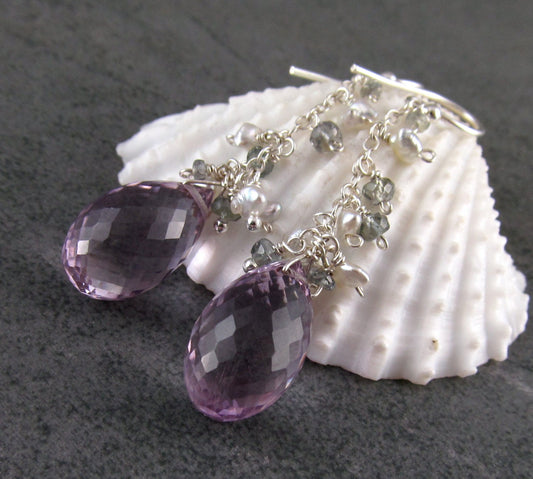 Pink amethyst earrings, handmade silver, Akoya saltwater pearl & green sapphire earrings, February birthstone-OOAK