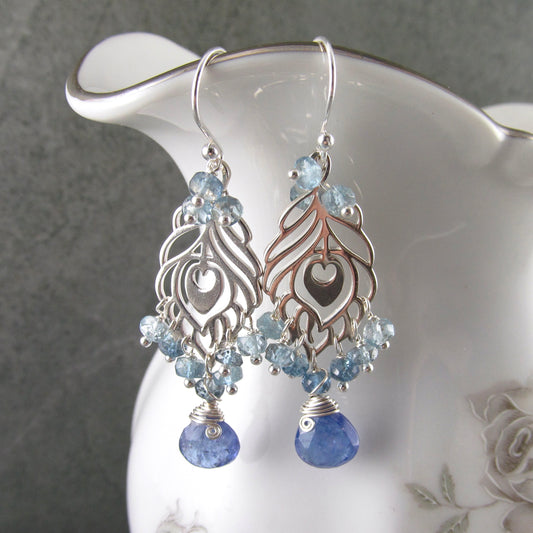 Peacock feather earrings, handmade sterling silver aquamarine and tanzanite chandelier earrings-OOAK