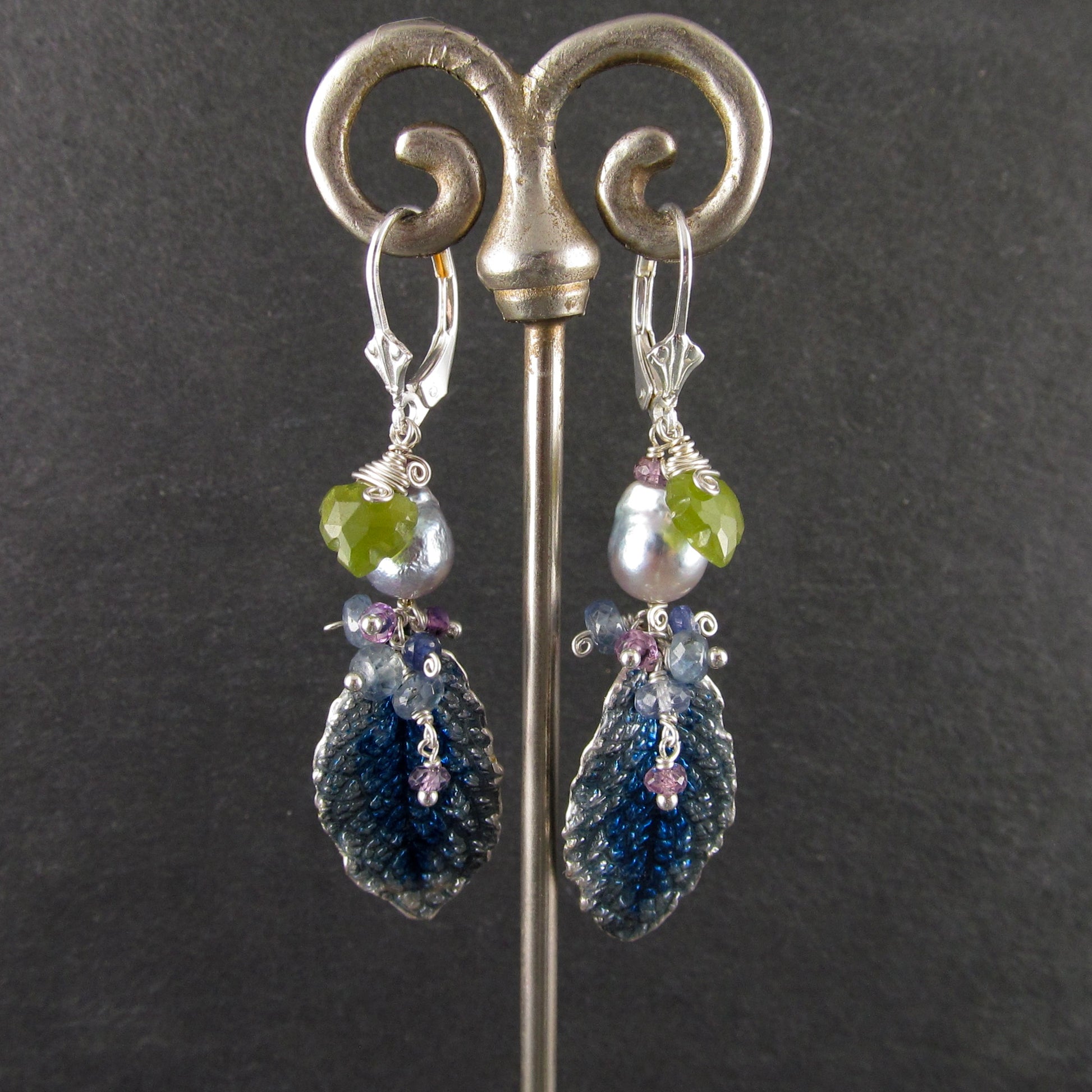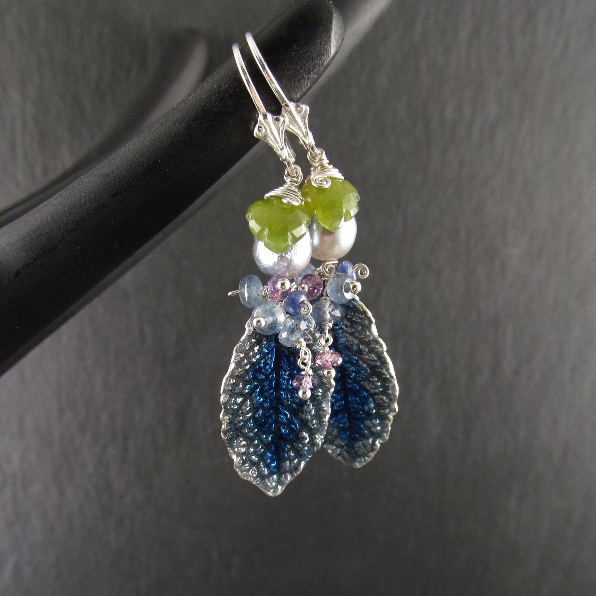 A deep indigo blue enamel graces these fine silver mint leaf earrings. I enameled them with transparent indigo and a light steel blue, for a lovely ombre effect. The leaves are topped with clusters of purple and blue sapphires, silver blue Akoya saltwater pearls, and carved vesuvianite leaves. My signature spirals abound. I finished them with sterling silver lever back ear wires. They measure 56 mm x 14 mm, or 2 1/4 inches long.